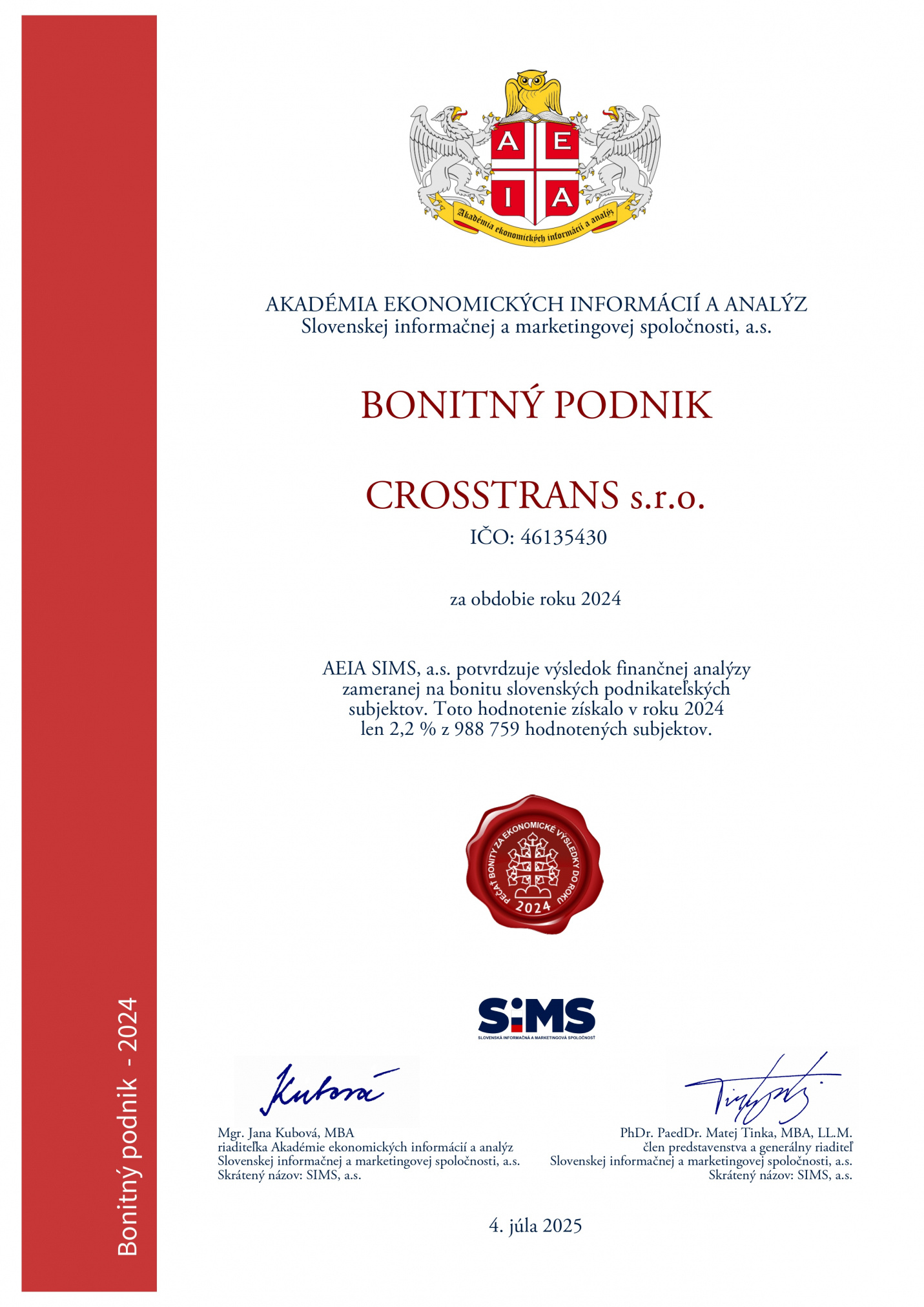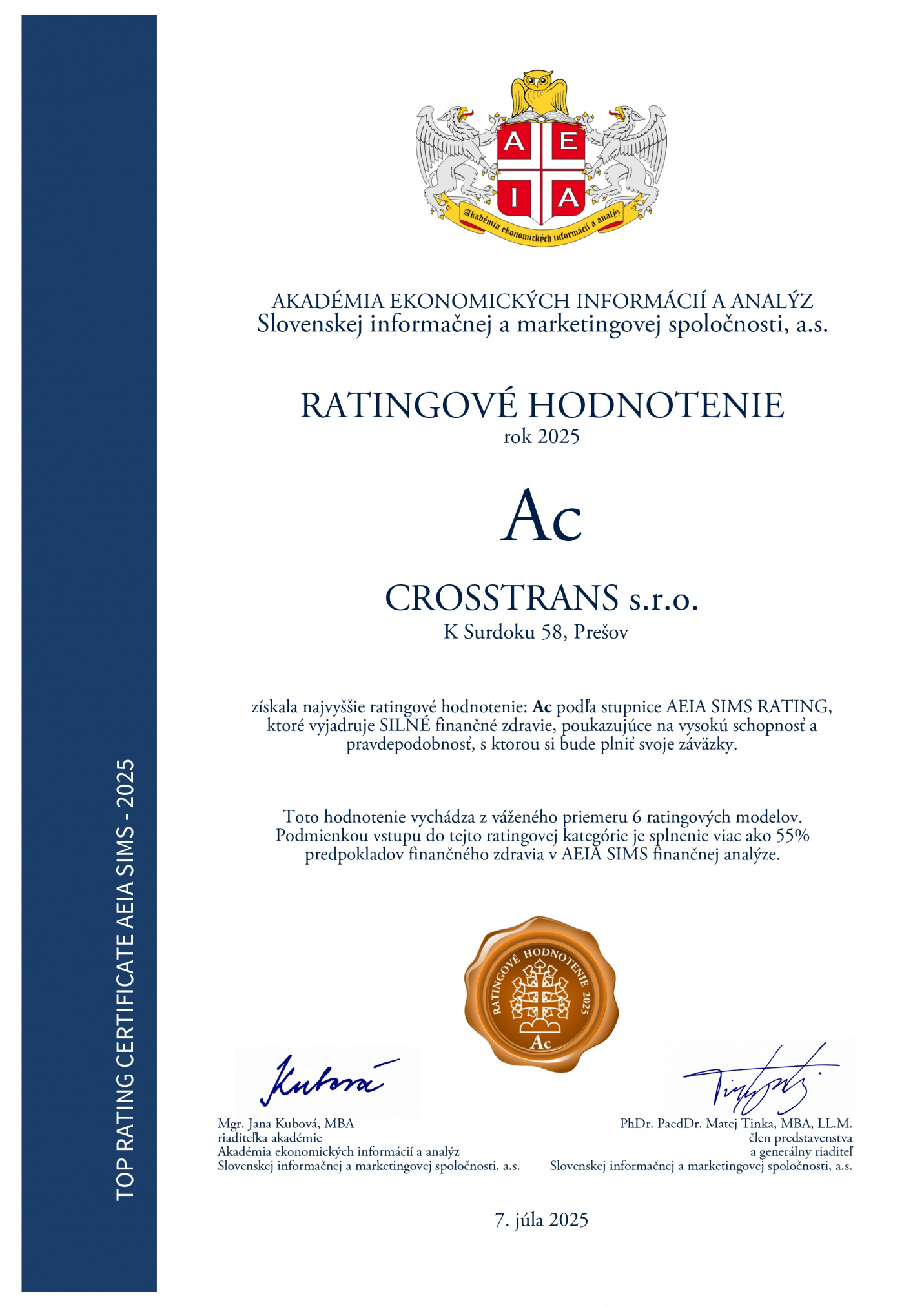 Význam: certifikát AA (alebo AAA) od Dun & Bradstreet je medzinárodne uznávaný a potvrdzuje vysokú úroveň spoľahlivosti a dôveryhodnosti spoločnosti